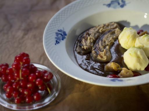 Andesteg med brune og hvide kartofler, skysauce, rødkål, æbler med ribsgelé og agurkesalat (cremet)