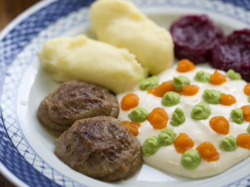 Frikadelle med bløde stegte løg, pebermayonnaise og drueagurk (cremet)